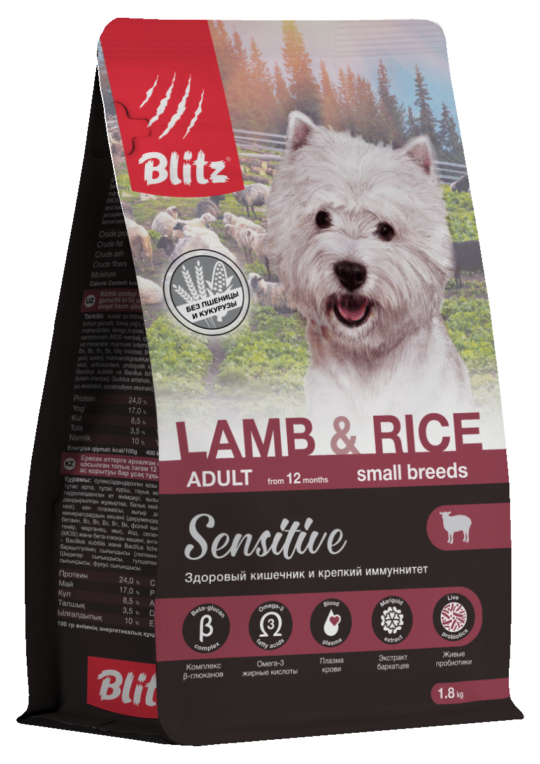 Дегидрированное мясо ягненка и свинины (30%), цельный ячмень, цельный рис, жир куриный, масло из кукурузного зародыша, гидролизованные мясные продукты, свекольная пульпа, дегидратированное яйцо, жир рыбий, яблоки, дрожжи (источник MOS), плазма крови, семена льна, комплекс витаминов и минералов (витамины: А, D3, Е, холин хлорид, бетаин, В3, В5, В2, В1, В6, фолиевая кислота, В12, калий, цинк, железо, марганец, медь, йод, селен), комплекс маннанолигосахаридов (МОS) и бета-глюканов, антиоксидант, комплекс пробиотиков - живые микроорганизмы Bacillus subtilis и Bacillus licheniformis, экстракт цветков бархатца (источник лютеина), топинамбур, экстракт юкки Шидигера, экстракт розмарина, экстракт фенхеля, экстракт фукуса.