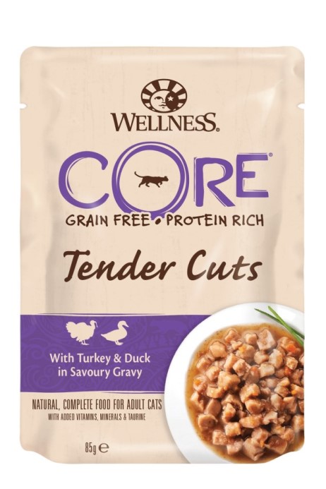 Wellness CORE — беззерновой полнорационный влажный корм класса холистик для взрослых кошек "CORE TENDER CUTS паучи из индейки с уткой в виде нарезки в соусе для кошек