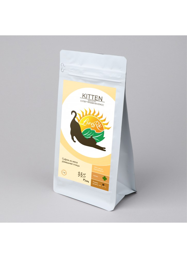 LiveRa KITTEN- Суфле из мяса домашней птицы, легкоусваиваемый, полноценный рацион для котят, изготовлен из нежного мяса курочки и диетического мяса индейки. В основе корма натуральные компоненты с добавлением необходимых витаминов и минералов для роста котенка. Сбор трав входящий в состав корма улучшает работу желудочно- кишечного тракта, поддерживает иммунитет ,способствует улучшению качества шерсти и состоянию кожи. Содержит большое количество таурина для хорошего зрения и здорового сердца. Содержит источники натуральной клетчатки для выведения волосяных комочков из пищеварительного тракта.