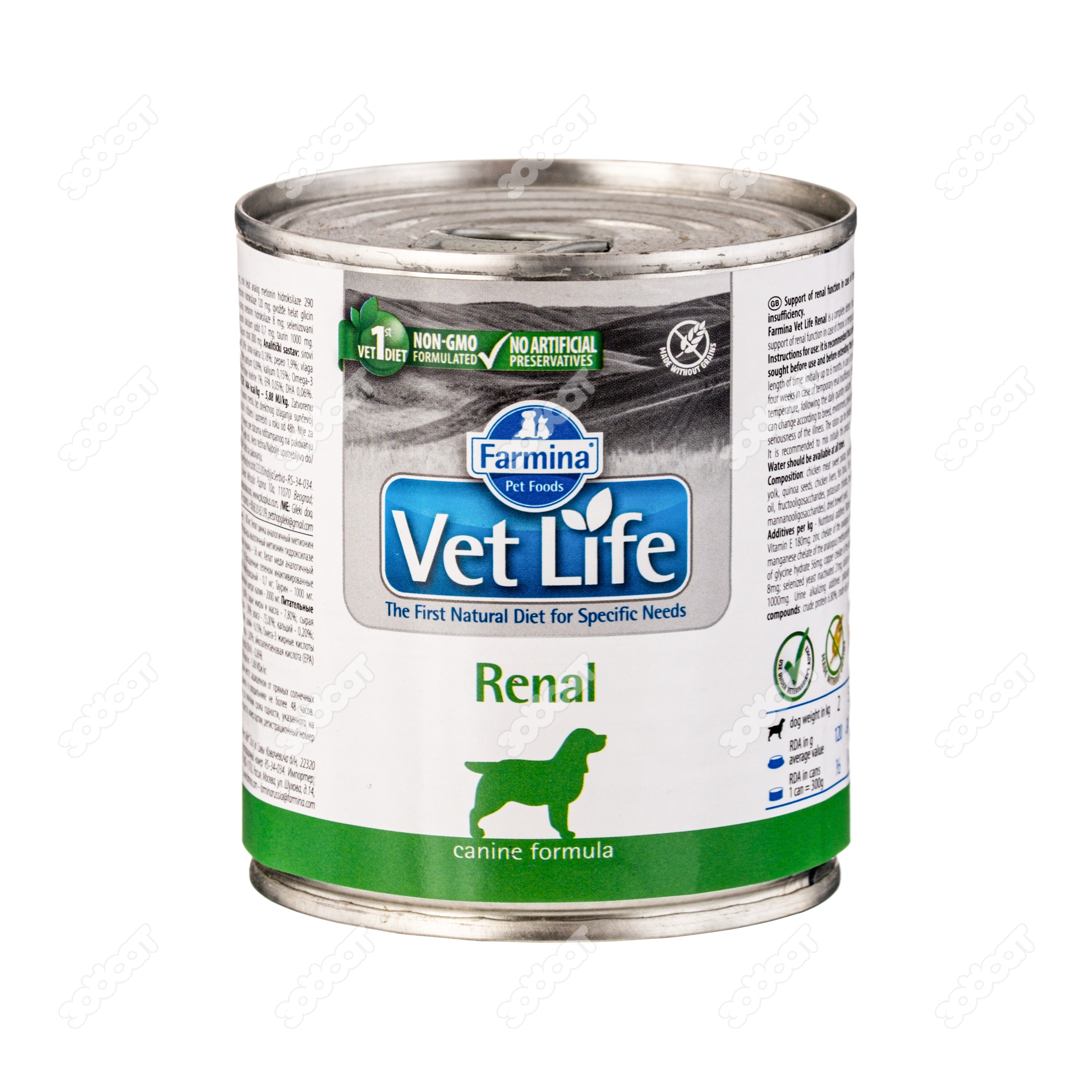 Хроническая болезнь почек; вспомогательная терапия при застойной сердечной недостаточности. Farmina Vet Life Renal – полнорационный диетический влажный корм для собак, специально разработанный для поддержания функции почек в случаях почечной недостаточности. ИНГРЕДИЕНТЫ Мясо курицы, сладкий картофель, гидролизат белка рыбы, сырой яичный желток, киноа, куриная печень, рыба (тунец), рыбий жир, карбонат кальция, льняное масло, фруктоолигосахариды, хлорид калия, волокна гороха, дрожжевой экстракт (источник маннанолигосахаридов), сухие пивные дрожжи. Пищевые добавки на кг: Витамин А – 4500 МЕ; Витамин D3 - 270 МЕ; Витамин Е - 180 мг; Хелат цинка аналогичный метионин гидроксилазе - 290 мг; Хелат марганца аналогичный метионин гидроксилазе - 120 мг; Хелат железа гидрата глицина – 56 мг; Хелат меди аналогичный метионин гидроксилазе – 8 мг; Обогащенные селеном инактивированные дрожжи – 21 мг; Йодат кальция безводный - 0,7 мг; Таурин - 1000 мг. Добавки для подщелачивания мочи: цитрат калия - 2000 мг. ПИТАТЕЛЬНЫЕ ВЕЩЕСТВА Сырой белок - 6,80%; сырые жиры и масла - 7,80%; сырая клетчатка - 0,18%; сырая зола - 1,90%; влага - 71,00%; кальций - 0,20%; фосфор - 0,09%; натрий - 0,09%; калий - 0,15%; Омега-3 жирные кислоты - 0,15%; Омега-6 жирные кислоты - 1,00%; эйкозапентаеновая кислота (EPA) - 0,05%; докозагексаеновая кислота (DHA) - 0,06%. Энергетическая ценность: 1332 ккал/кг - 5,57 МДж/кг. ЭНЕРГЕТИЧЕСКАЯ ЦЕННОСТЬ EM Kcal/Kg 1404 - Mj/Kg 5,87