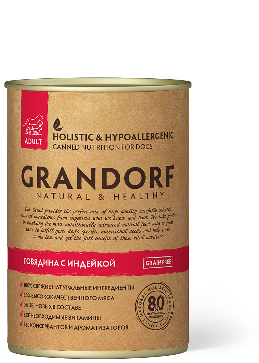 Говядина 40%, индейка 40%, собственный бульон 13,1%, минералы 6,4%, витаминно-минеральный премикс 0,4%, глюкозамин 0,1%