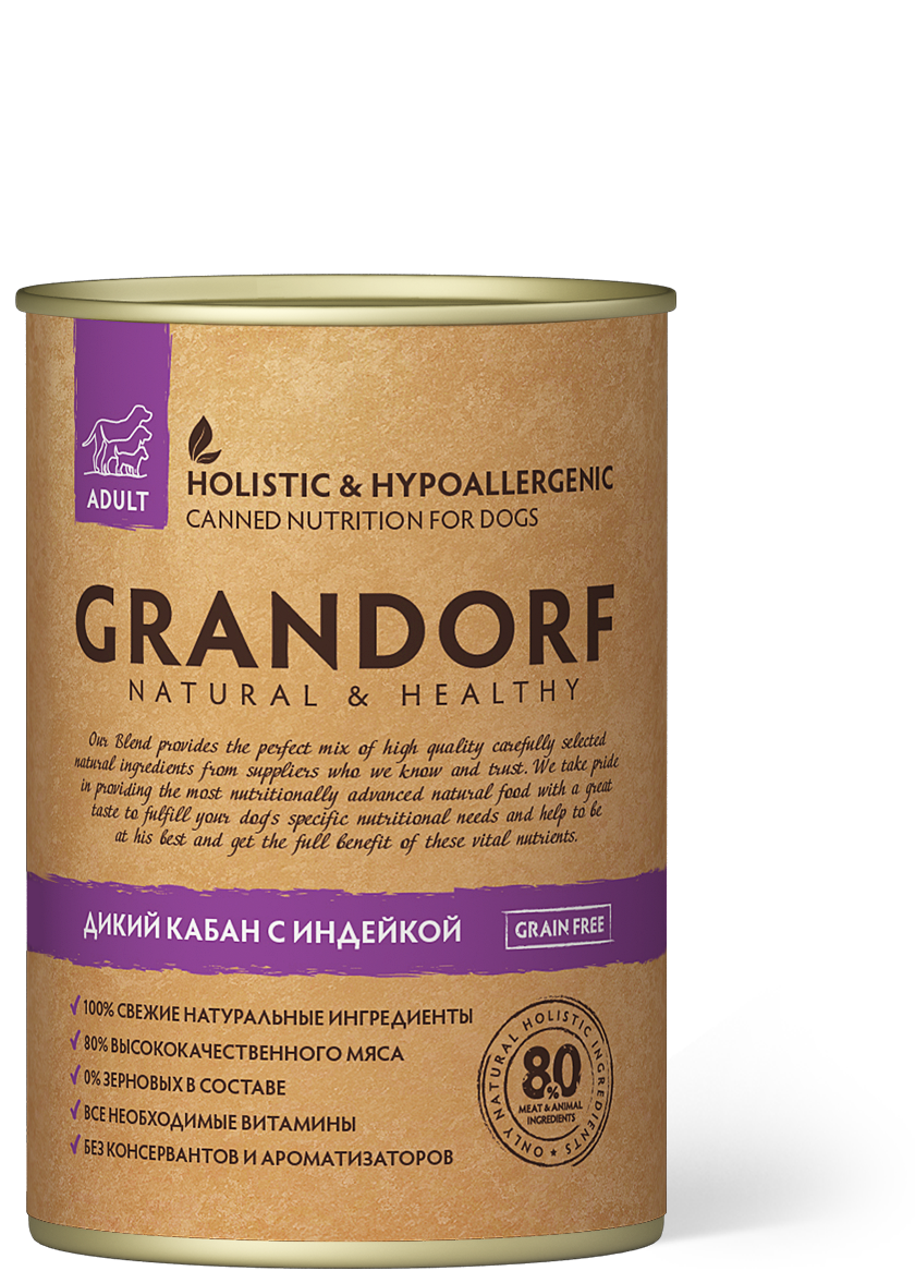 Дикий кабан 40%, индейка 40%, собственный бульон 13,1%, минералы 6,4%, витаминно-минеральный премикс 0,4%, глюкозамин 0,1%