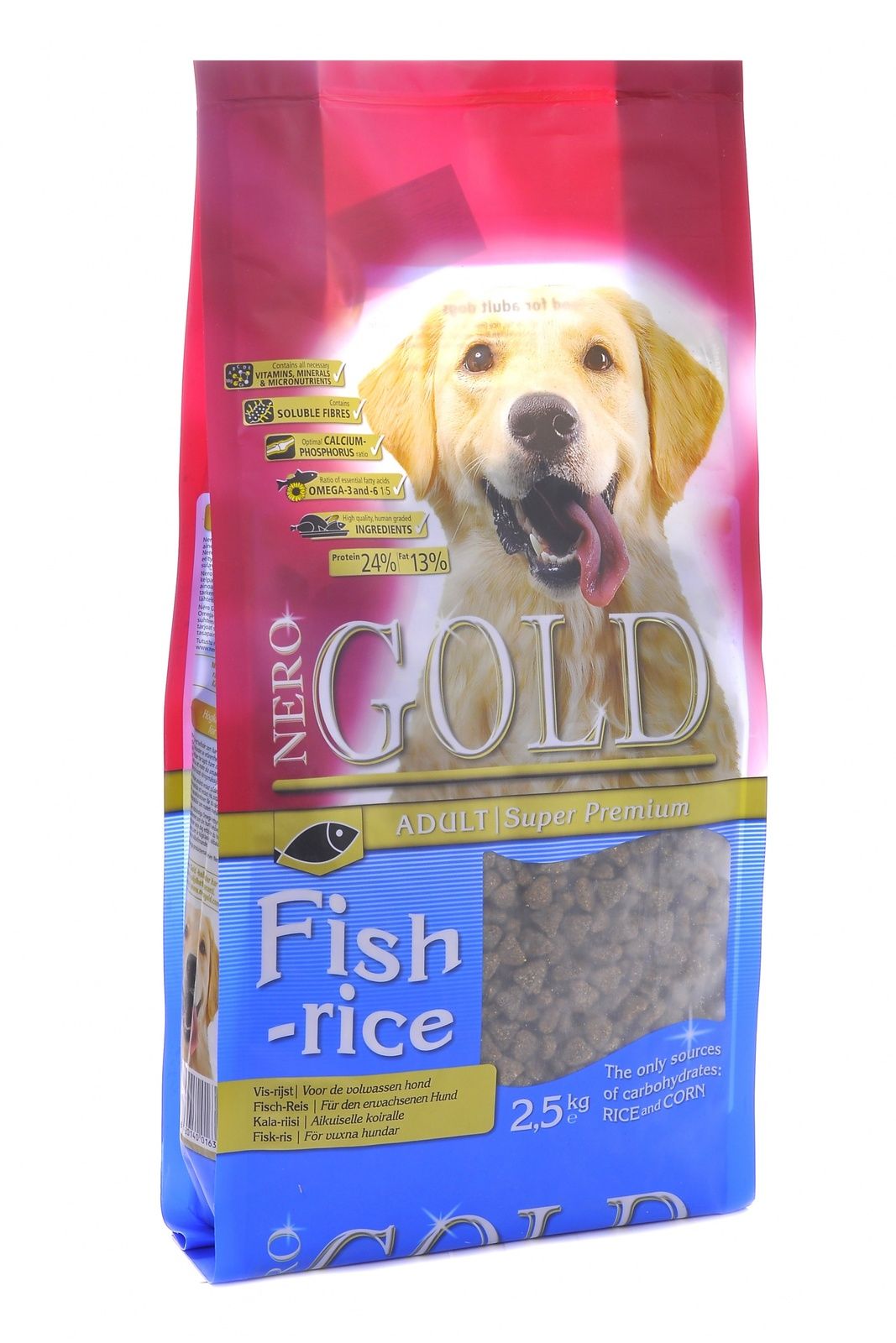 дегидрированная рыба (мин. 24%), рис (мин. 18%), маис, овощи, куриный жир, мякоть свеклы, льняное семя, гидролизованная куриная печень, минералы и витамины, дрожжи, хондроитин и глюкозамин, L-карнитин, лецитин, инулин (ФОС), таурин.