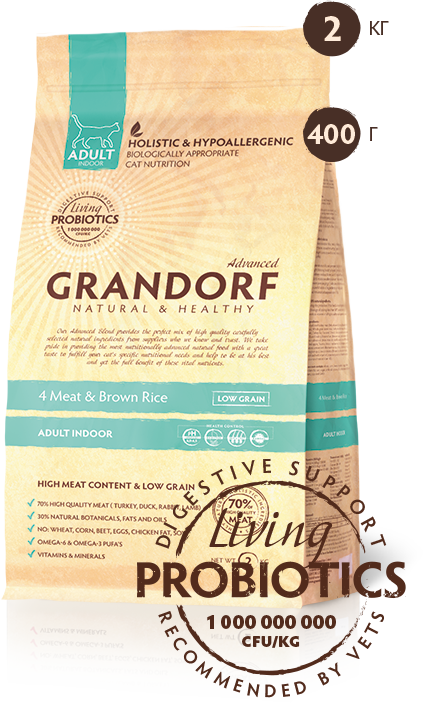 Сухой корм "Grandorf 4 Meat & Brown Rice Indoor" для кошек с живыми пробиотиками.