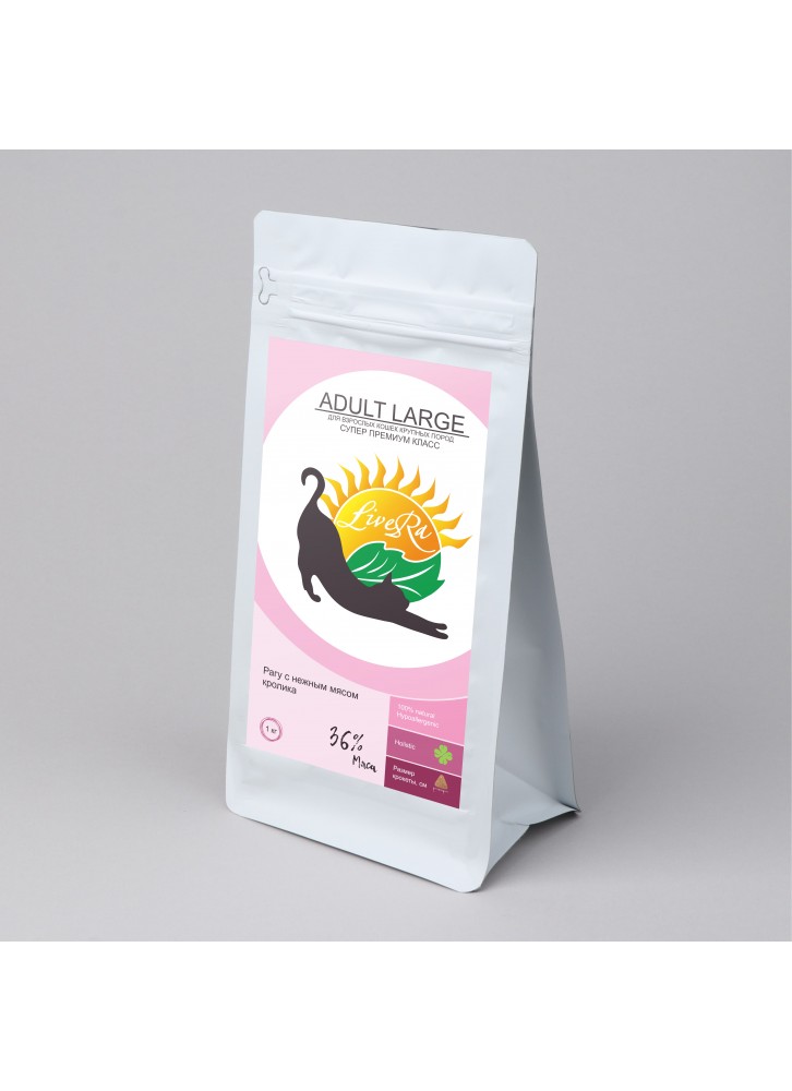Рагу с нежным мясом кролика корм для взрослых кошек крупных пород LiveRa -сбалансированный рацион на основе мяса индейки и кролика, содержащий в себе оптимальное сочетание жиров, всех необходимых витаминов и минералов, который позволит обеспечить Вашей кошке долгую здоровую активную жизнь и прекрасную физическую форму на длительное время. Состав корма способствует сохранению эластичности кожи и приданию блеска шерсти, повышает иммунитет, сохраняет зрение, обеспечивает здоровый опорно-двигательный аппарат, стабилизирует работу пищеварительной системы, улучшает работу мочеполовой системы.Специальный размер гранул предотвращает слишком быстрое поглощение корма, которое может привести к проблемам с пищеварением. Также в процессе разгрызания особая структура гранул способствует укреплению зубов и десен и их механической чистке. Поэтому корм лучше давать животному сухим и следить при этом, чтобы постоянно была свежая вода в свободном доступе.