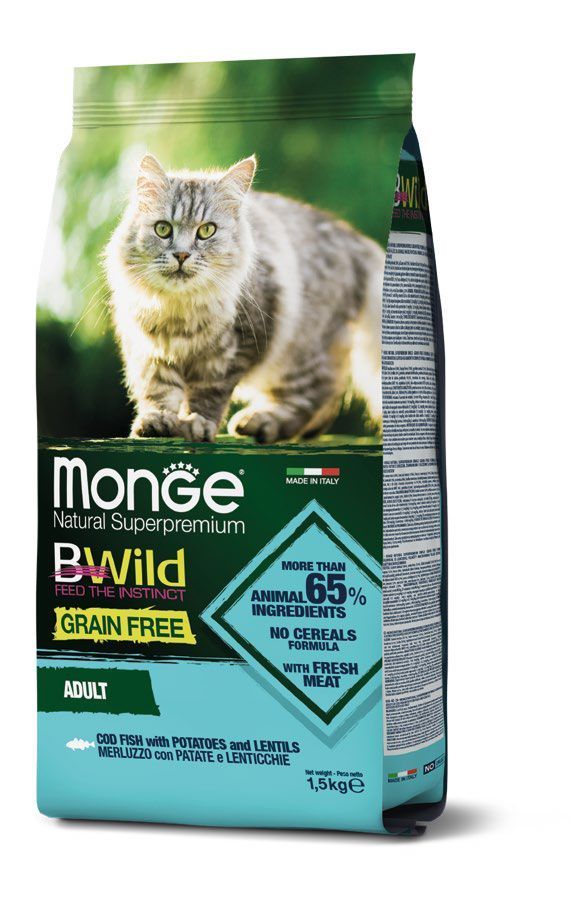 Monge Cat BWild Grain Free Adult Codfish (беззерновой корм из трески, картофеля и чечевицы для взрослых кошек)