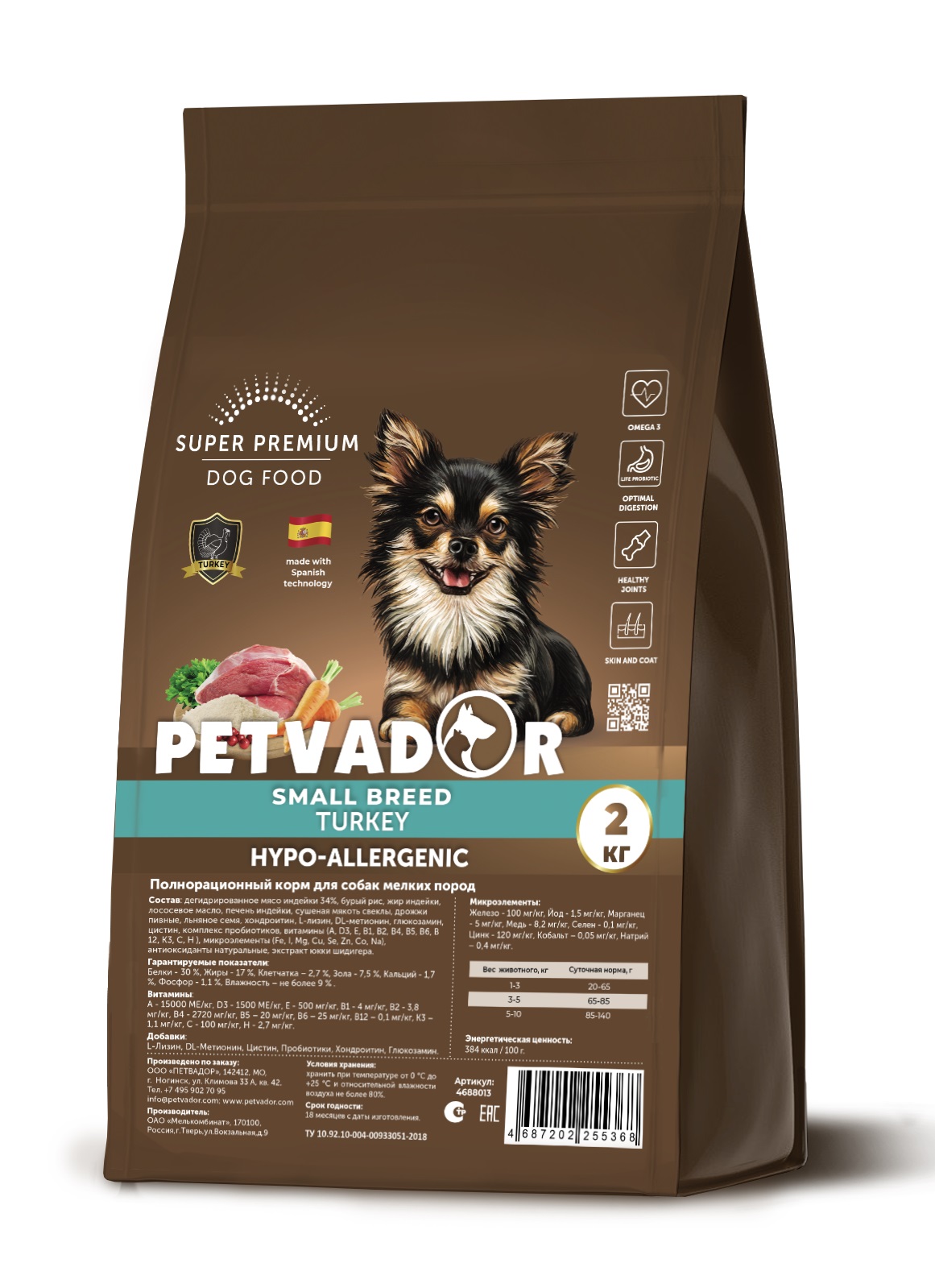 Полнорационное питание PETVADOR SMAL BREED разработано специально для взрослых собак мелких пород на основе легкоусвояемого мяса индейки. Индейка - это не только прекрасный источник высококачественного белка, но и возможность обеспечит организм маленькой подвижной собаки необходимыми микроэлементами и витаминами.